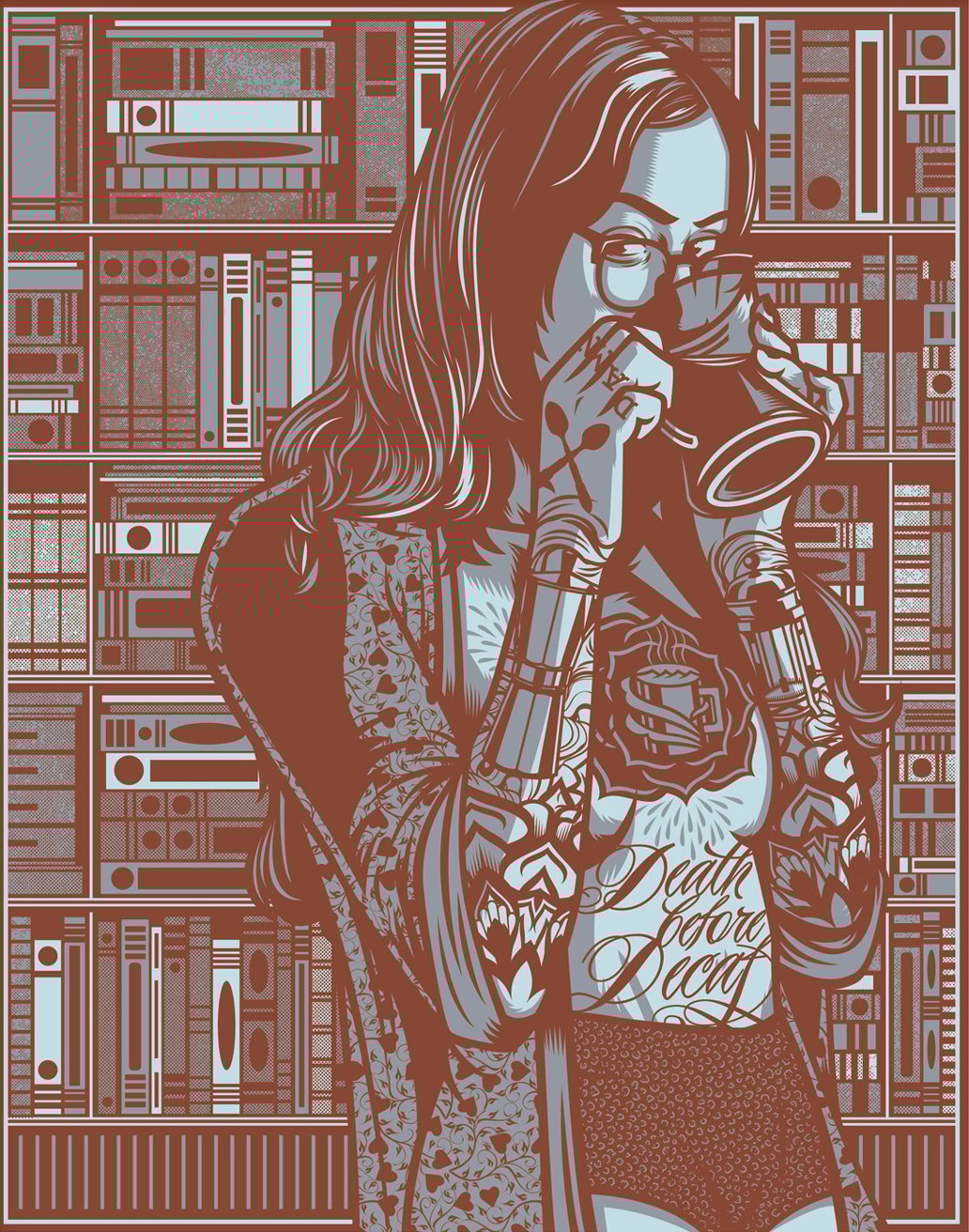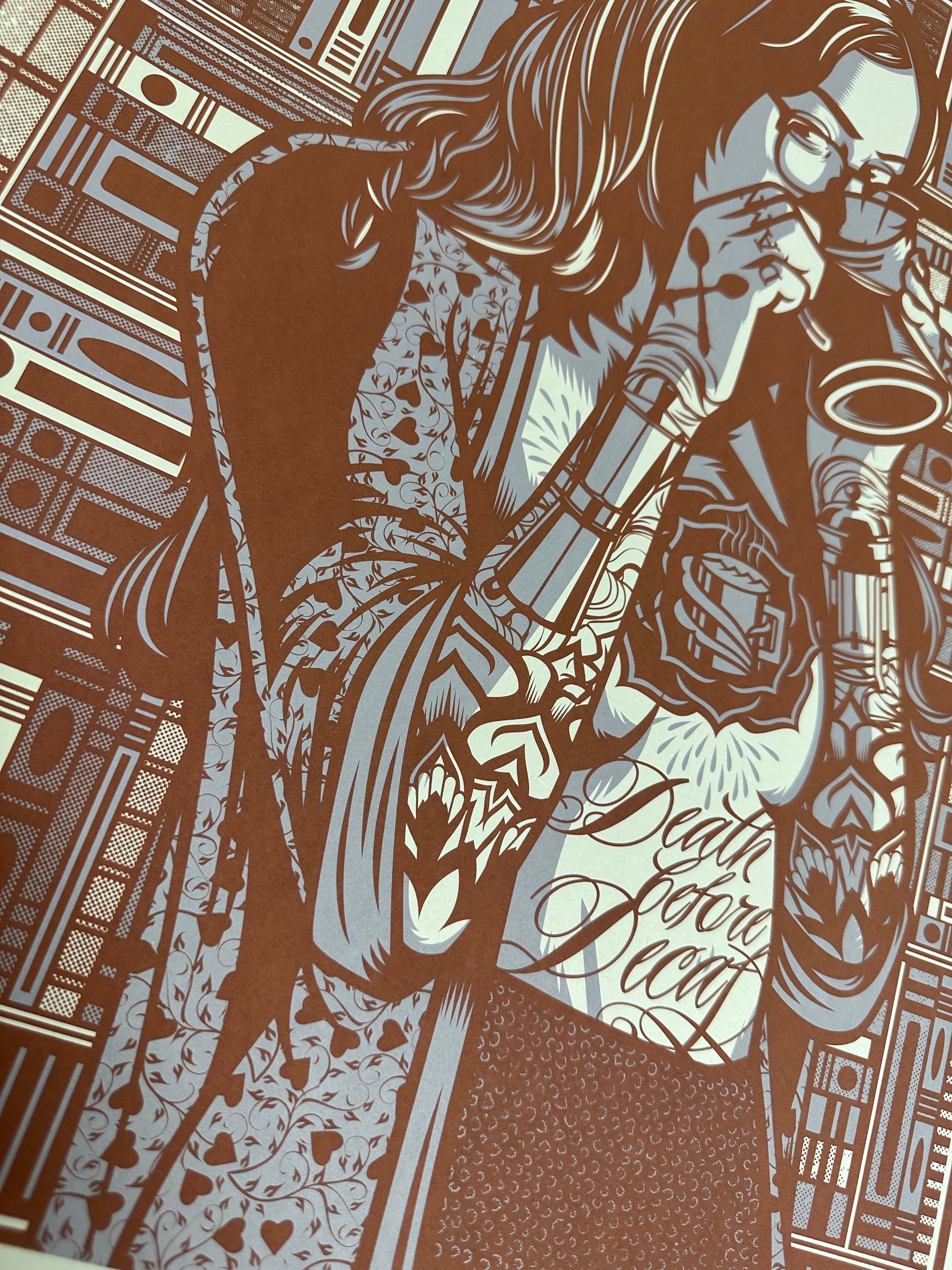 "Death Before Decaf" screen print by Rockets Are Red signed, limited edition two color screen prints 18" x 24" $45 USD