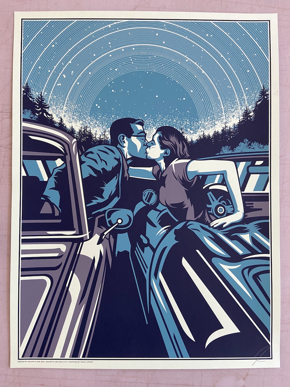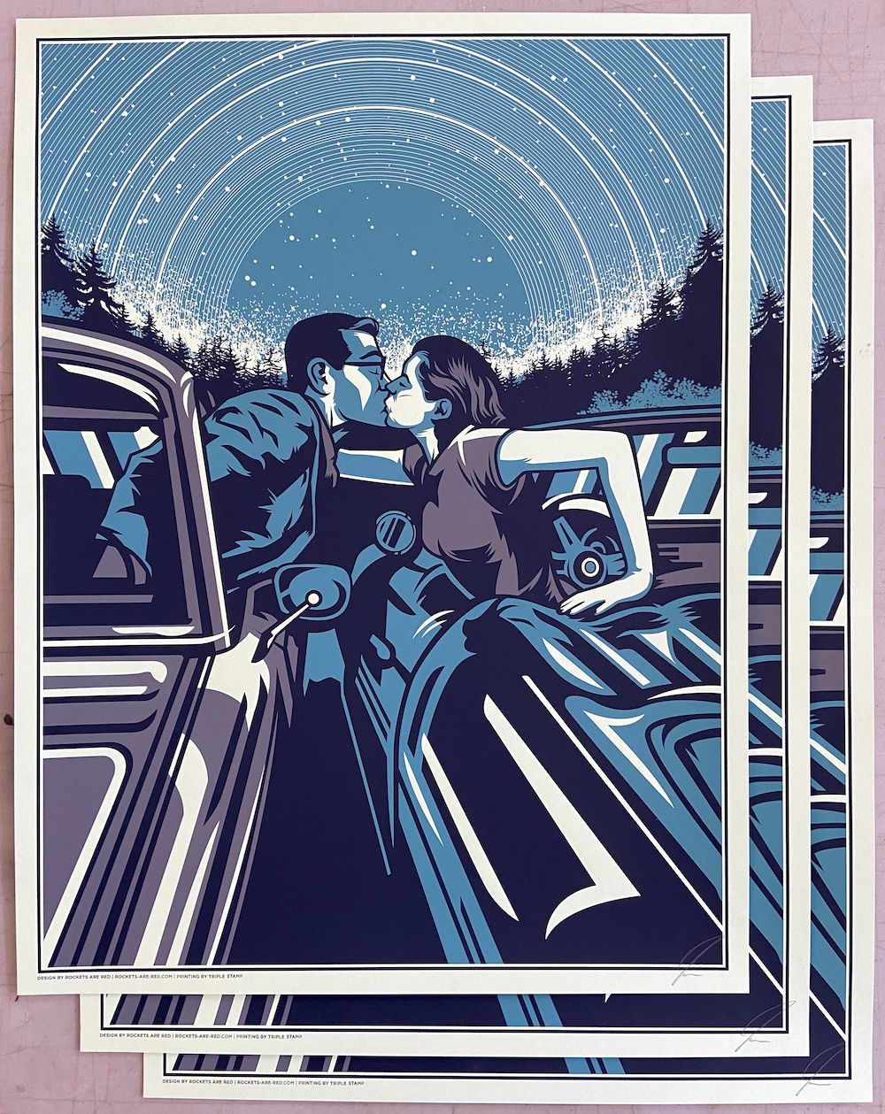"Car Kiss" by Rockets Are Red 3-color screen print, signed open edition, ships flat 18" x 24" $100 USD