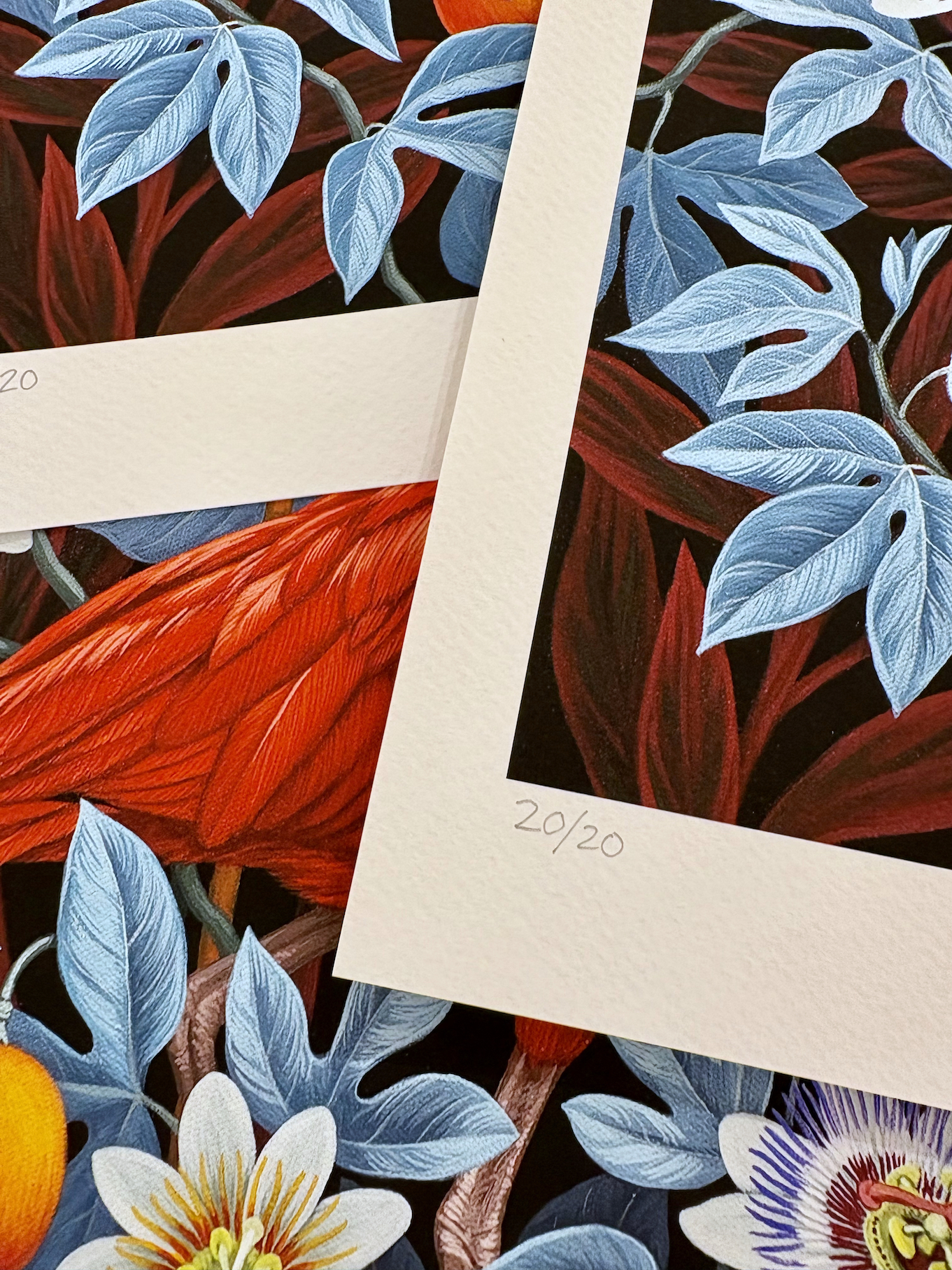 "Ibises" is a limited edition archival pigment print of the original painting by Vasilisa Romanenko from the artist's sold out 2024 solo exhibition "Botanical Dreamscape." Digitally printed at Arch Enemy Arts on Hot Press 300 gsm heavyweight paper, this print features two beautiful birds surrounded by Romanenko's signature decorative foliage with pops of white and purple Passion flowers.