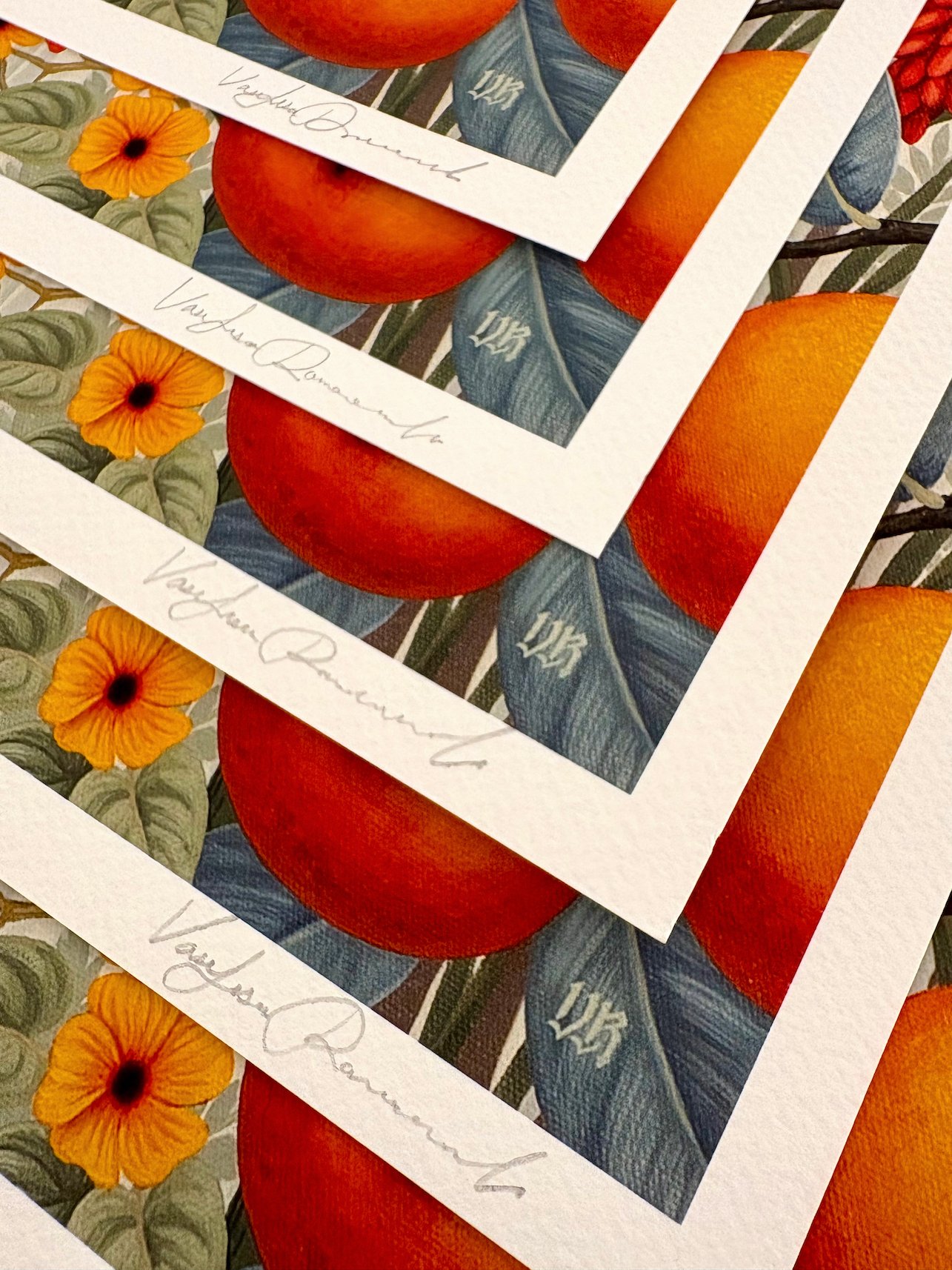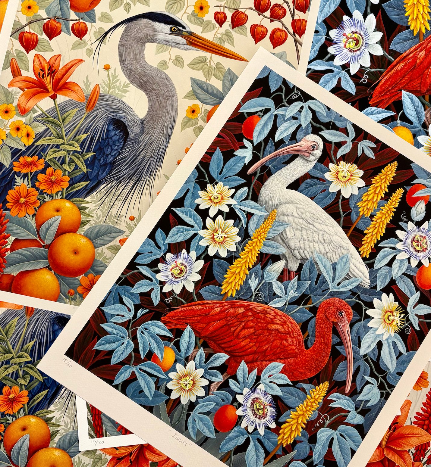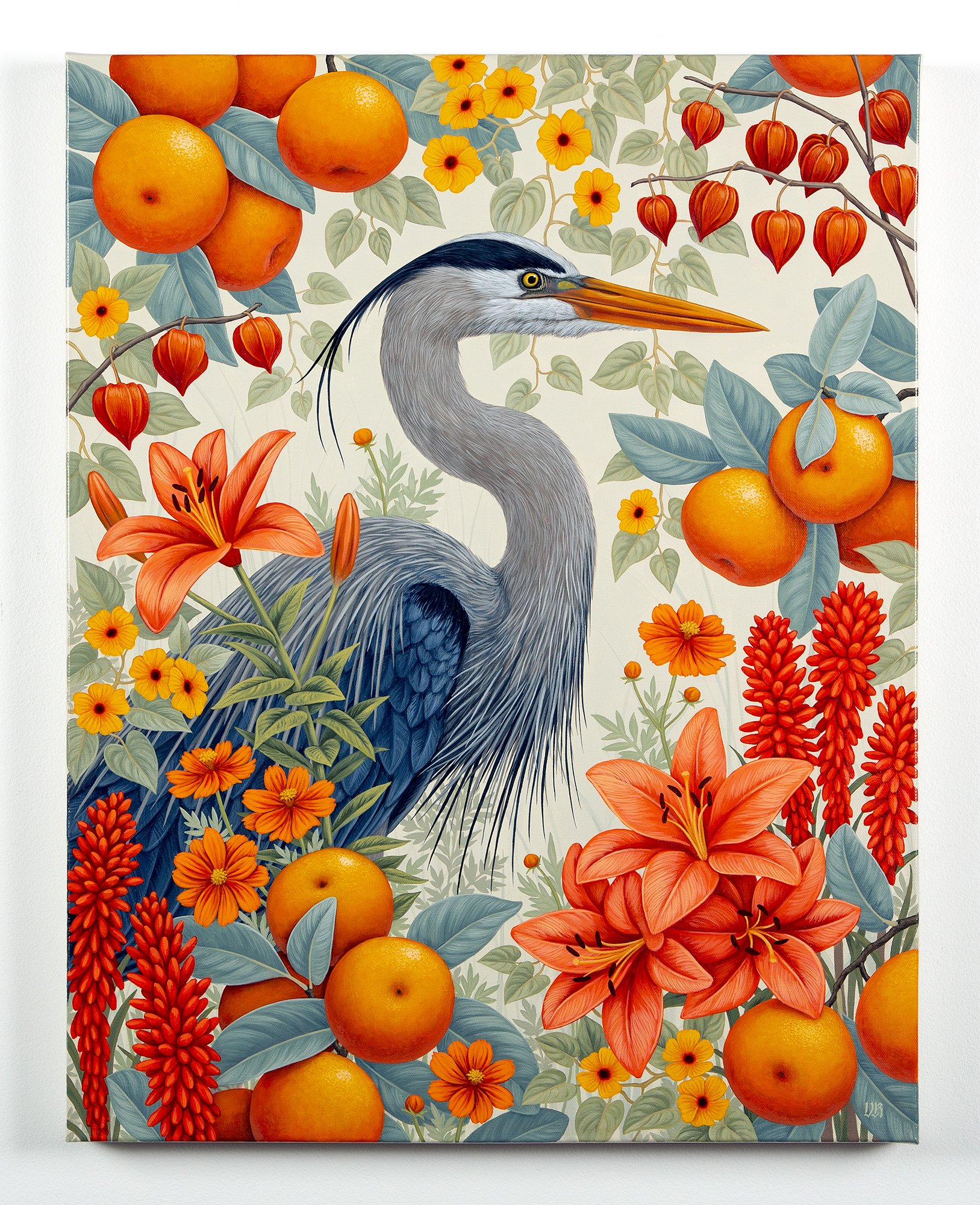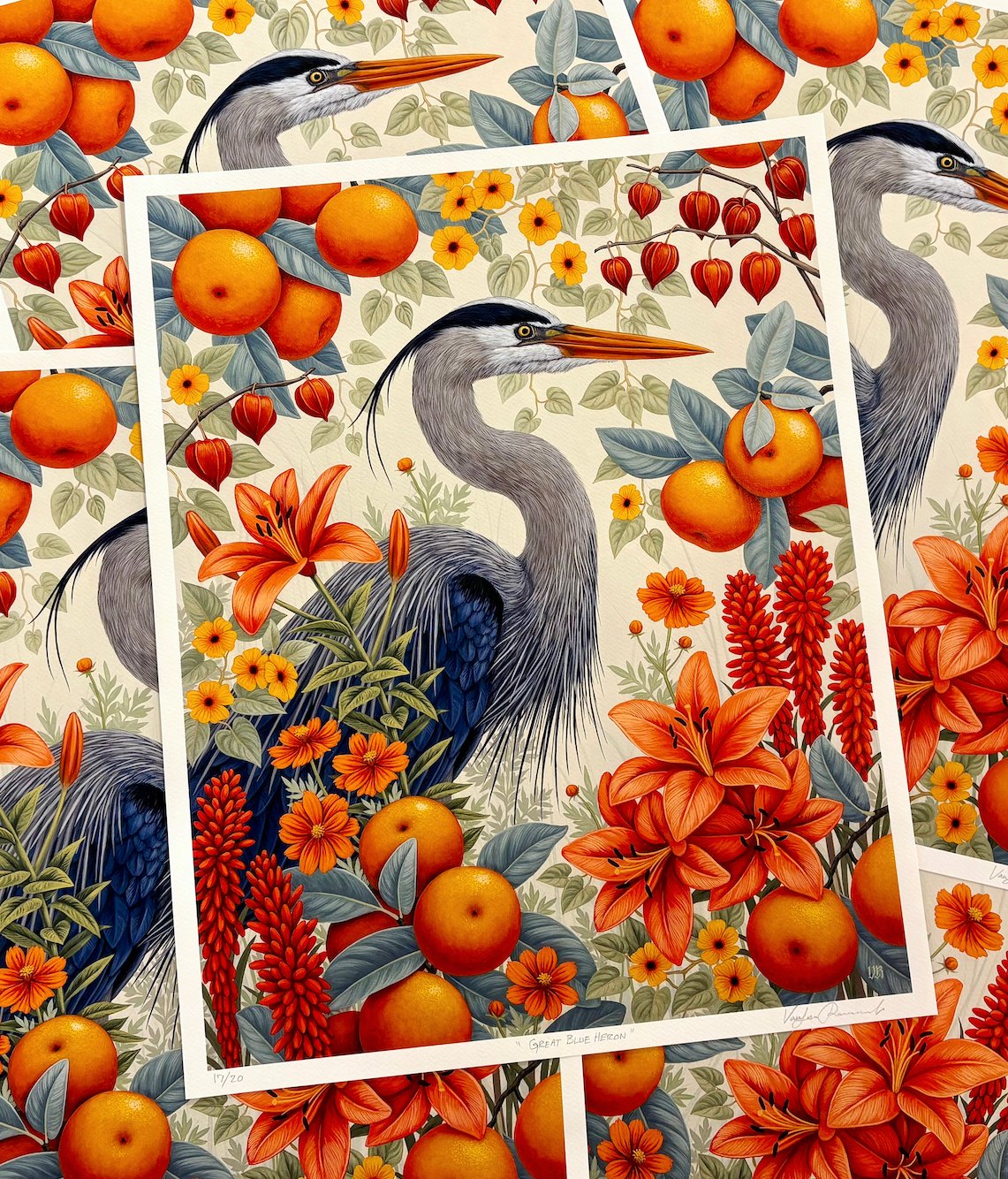 "Great Blue Heron" is a limited edition archival pigment print of the original painting by Vasilisa Romanenko from the artist's sold out 2025 solo exhibition "Birds & Blooms." Produced at Arch Enemy Arts on Hot Press 300 gsm heavyweight paper, this print features a beautiful tropical bird surrounded by Romanenko's signature decorative foliage with pops of bright orange lilies and citrus fruits.